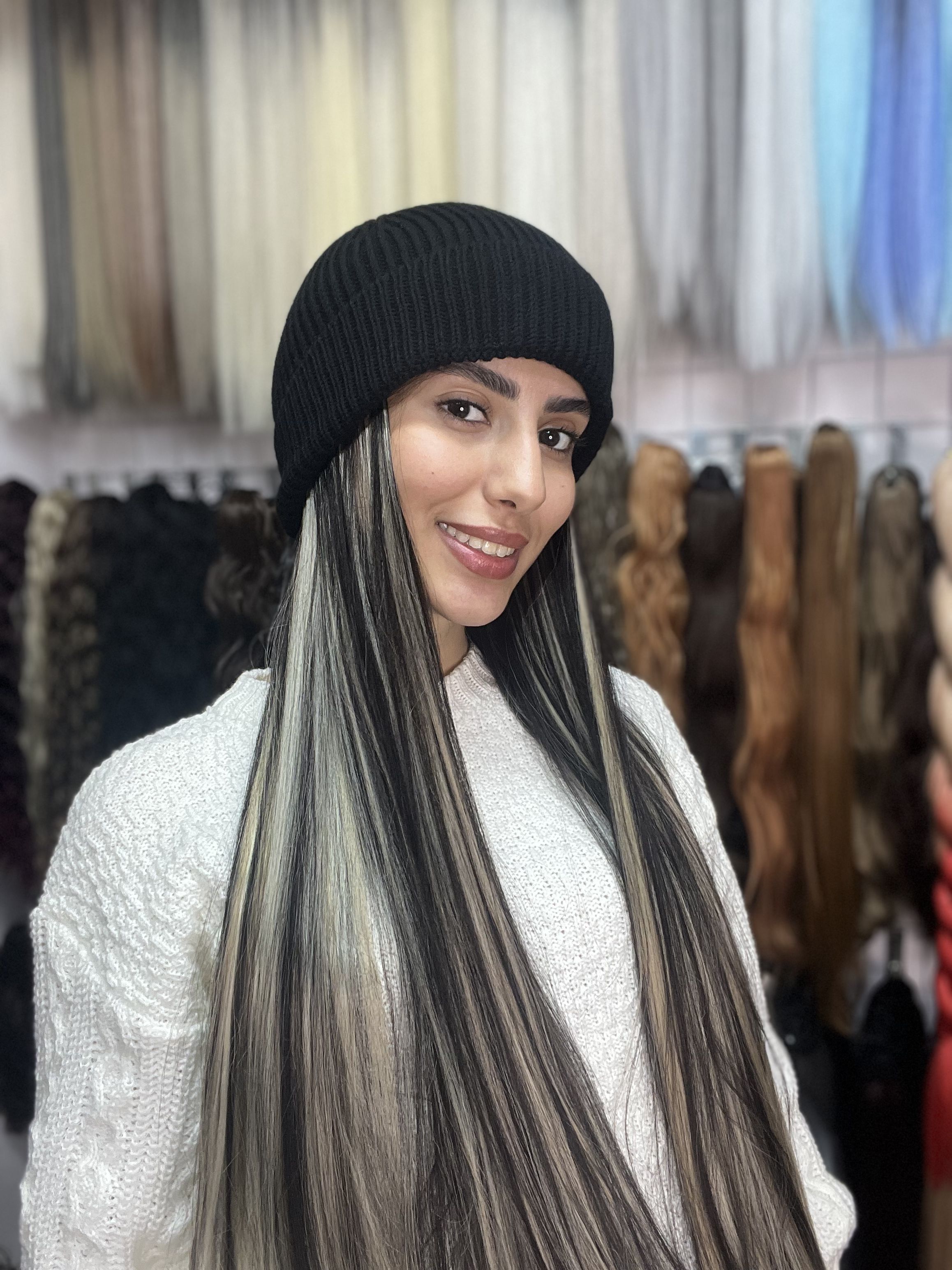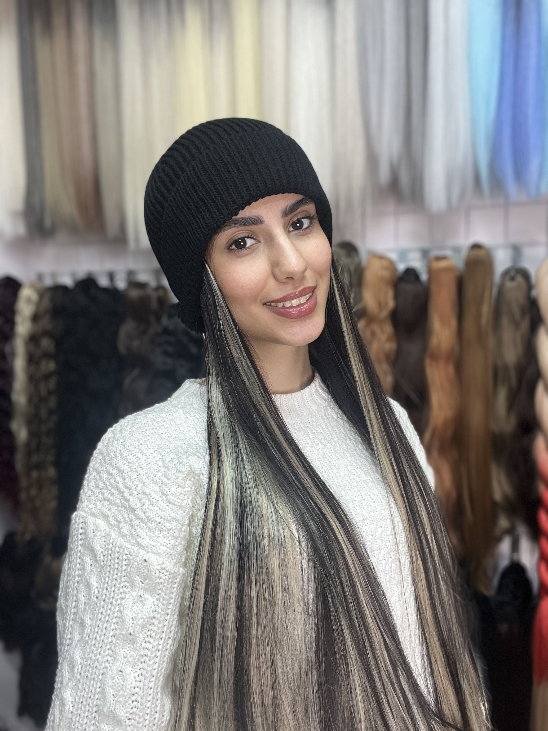 کلاه مویی بافت -رنگ لایت مشکی بلوند-الیاف ابریشمی درجه 1-قابل حرارت و شستشو-قد65سانت